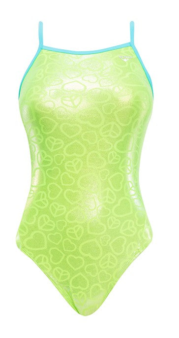 The Finals Women's Funnies Peace & Love Foil Wing Back SwimsuitThe Women's Peace & Love Foil Funnies Wing Back Swimsuit utilizes sleek Poly/Spandex fabrication with a shiny foil finish to provide performance in and out of the water. Featuring a wing back design, the 7853A Funnies swimsuit offers minimal coverage without sacrificing support and provides the same level of comfort as our butterfly back. Thin straps, an elevated leg line and full yellow lining make this Funnies swimsuit for women a stylish alternative for training and is an ideal choice for swim teams, clubs and competitive swimmers who want an edge.